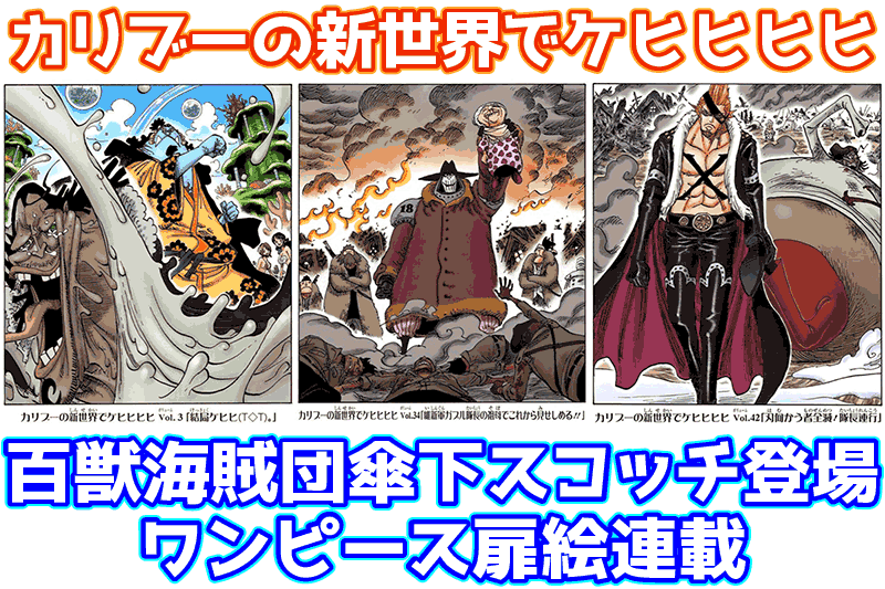 ワンピース扉絵連載20弾カリブーの新世界でケヒヒヒヒはワンピース68巻674話から73巻731話まで掲載された、ロギア(自然)系の悪魔の実ヌマヌマの実の能力者でカリブー海賊団船長のカリブーが、魚人島でルフィ達に瞬殺され、ビッグ・マム海賊団のペコムズに敗北した後、再び魚人島の人魚たちを襲うがジンベイに倒され、新世界の海軍支部G-5に連れて行かれる様子を描いた短期集中表紙連載。